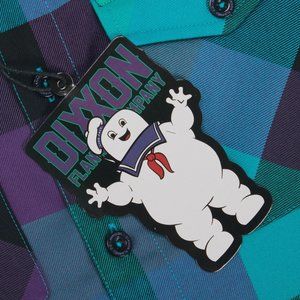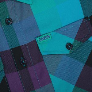 Green and purple Dixxon brand tag on the left chest pocket