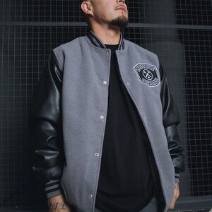 Stylish DIXXON varsity jacket. Features gray and black design. Perfect for casual wear.