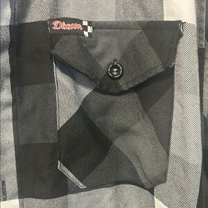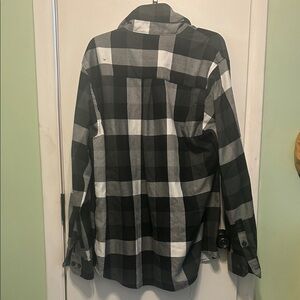Classic black and white checkered flannel. Button-up design with dual chest pockets.