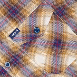 Men’s gold, white, red, and blue plaid patterned flannel shirt