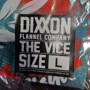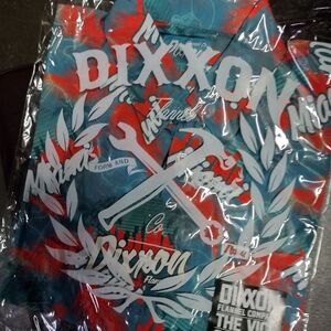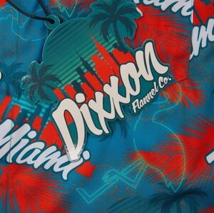 Vibrant DIXXON shirt with teal and red hues. Features Miami theme and palm designs.