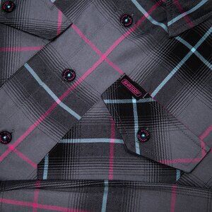 Men’s gray, black, pink, and blue plaid patterned flannel shirt