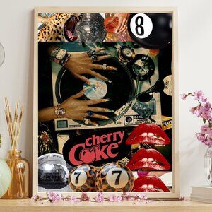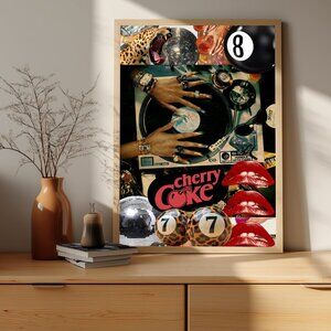 "Add a bold and unique touch to your space with this 11x17 black framed art piece. Featuring a dynamic DJ and disco theme, this eye-catching design blends leopard print patterns, cherry coke branding, a fun 8 ball design, and striking red lips. Perfect for music lovers, party enthusiasts, and anyone looking to elevate their decor with a pop of color and style. This framed artwork is a great conversation starter and makes a perfect gift or statement piece for any room. Ready to hang, it’s a must-have for those who appreciate vibrant, nostalgic, and artistic designs
