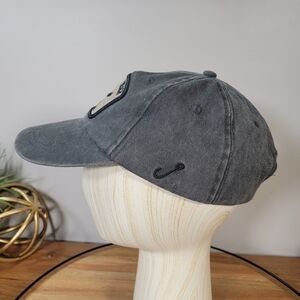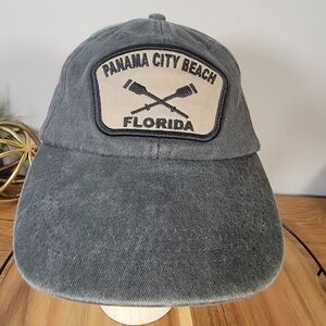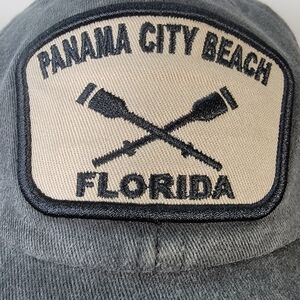 Charcoal Gray distressed wash finish ball cap with black and tan embroidered patch - Panama City Beach Florida. Adjustable back closure