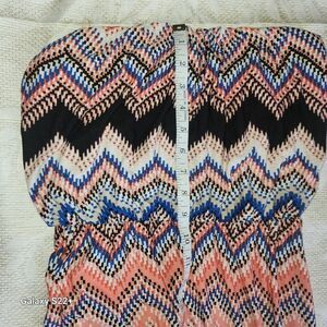 DESCRIPTION: Strapless maxi dress has an orange, blue, and black chevron pattern. With elastic around the top and at the waist. Sexy style!