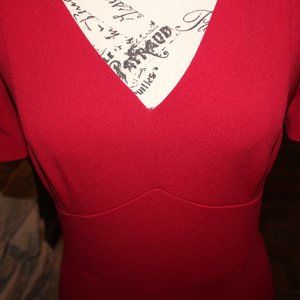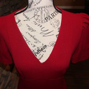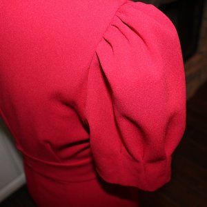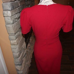 Red DKNY v neck short puff sleeve dress. Center zip-back closure. Stretchy fabric - 94% Polyester 6% spandex. 36 inches long shoulder to hem. Bodice is lined. Dry clean.
