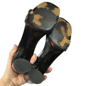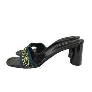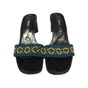 Beaded DKNY slides with leather soles and patent leather heels. Possibly vintage. 3” heels.