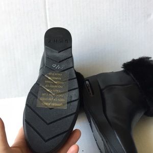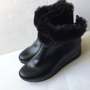 New without box, DKNY Women's Abri Booties, exposed zippers and extra-cozy faux-fur cuffs bring smart style to the Abri wedge ankle booties from DKNY., DKNY black leather and faux fur wedge heel ankle boots with back zippers.