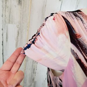 ~ Description: Purple, pink, blue and ivory abstract brush stroke pattern dress, short ruched sleeves, back zipper closure, stretchy jersey knit