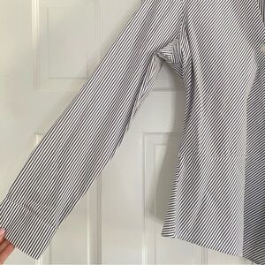 Chic asymmetrical button down. Black and white stripes. Long sleeves. Modern style.
