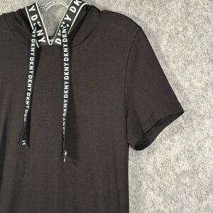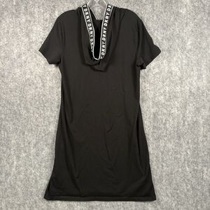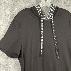 DKNY Athleisure Black Hooded Logo A Line Dress Sz Med Stretch Knit Short Sleeve