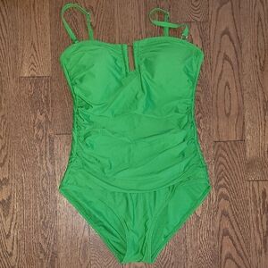 Make waves in this one-piece statement swimsuit from DKNY, styled with a flirty T-back design. Removable cups. Full bottom coverage. Pull-on style; adjustable spaghetti straps. Solid V-neck. Allover news-style logo print; open T-back detail. Lined. Hand wash.
