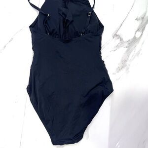 Preowned Experience the elegance of DKNY's black one-piece swimsuit, crafted with a focus on timeless design and classic silhouettes. This piece features a sleek, monochromatic look with subtle ruching details, offering a sophisticated and versatile swimwear option. Perfect for those who appreciate understated style and quality craftsmanship.