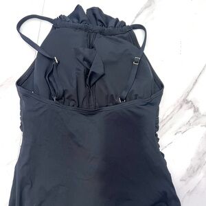 DKNY Black Classic One Piece halter swimsuit ruffle front detail 6