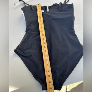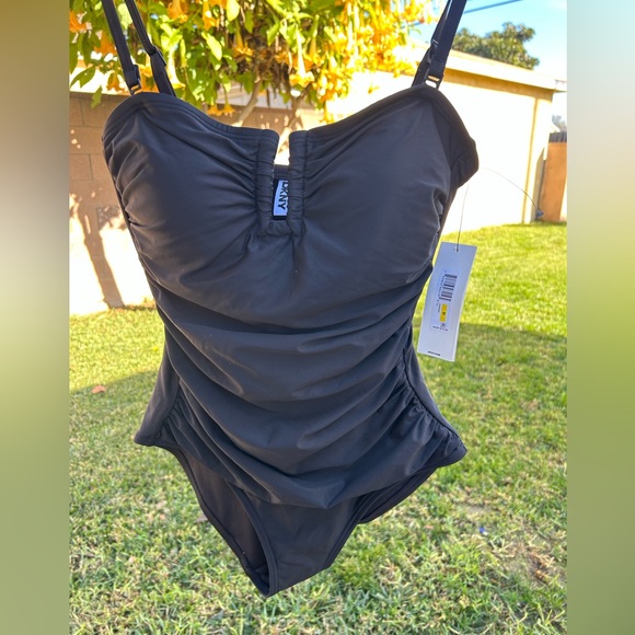 Elegant black one-piece with ruched front. Perfect for poolside elegance.