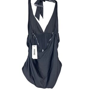 Keywords: DKNY Swimsuit, Black One Piece, Halter Swimsuit, Tummy Control, Ruched Swimsuit, Womens Swimwear, Size L, New with Tags, UPF 40+, Stretch Fabric, Removable Cups, Summer Fashion, Poolside, Beachwear