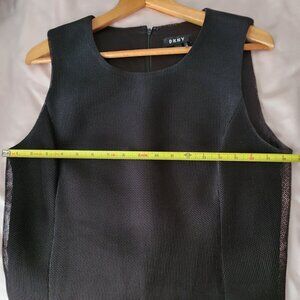 Elegant sleeveless black DKNY dress featuring a sheer mesh overlay with striking white leaf embroidery along the hemline. The dress has a flattering fit-and-flare silhouette with a fully lined interior and hidden back zipper closure. Perfect for cocktail parties, evening events, or semi-formal occasions.