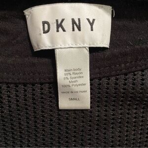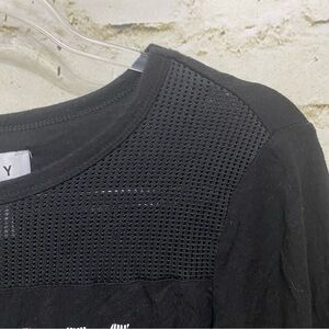 DKNY Womens Small Black Mesh Spell Out Cropped T Shirt in good used condition. There is some wash wear. No stains, tears or rips.