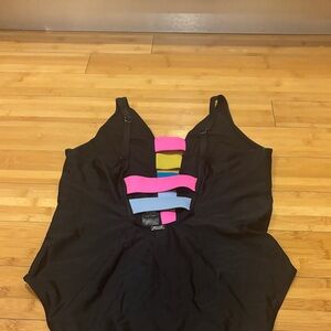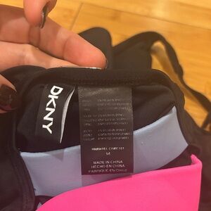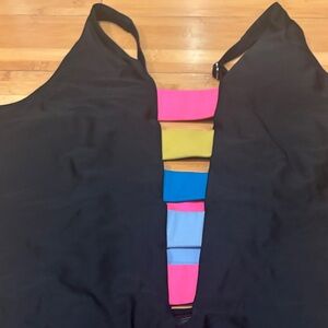 DKNY Black One-Piece Swimsuit with Pink, Yellow, and Blue Stripes