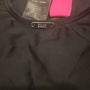 Stylish black one-piece by DKNY. Features bold pink, yellow, and blue stripes. Ideal for beach or pool.