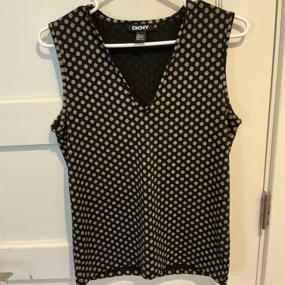 Elevate your wardrobe with this chic DKNY black polka dot top. Perfect for any occasion, this stylish piece offers a flattering fit and timeless design.