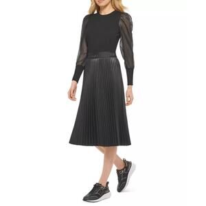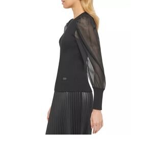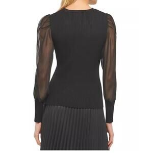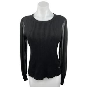 DKNY Black Sheer Sleeve Ribbed Knit Crewneck Mesh Long Sleeve Sweater Top L