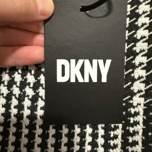 Chic DKNY mini dress with a houndstooth pattern. Features a sleeveless sheath design with black faux leather trim