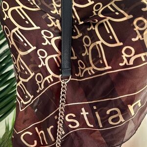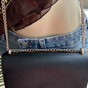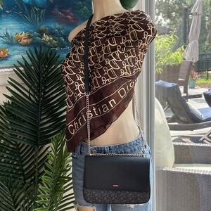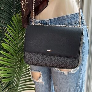 Stylish DKNY crossbody bag with a chic chain gold strap. Features a sleek black and gray design. Perfect for versatile wear.