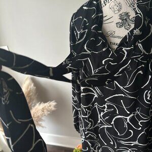 DKNY Black and White Abstract Print Blouse with Tie Detail - Size XL