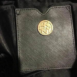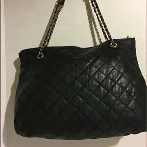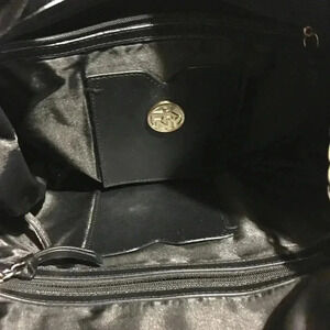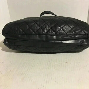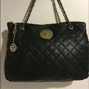Authentic DKNY Black lamb Napa leather shoulder handbag with gold- tone hardware & trim with gold chain with leather strap main compartment 4 pockets at exterior wall 2 zip closure & zip closure at top exterior snap have some cracks interior have mirror scratches hardware have some discoloration please check all photos hight 11” width 14” depth 1.5” Strap drop 10.5”