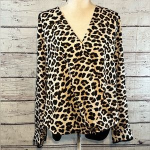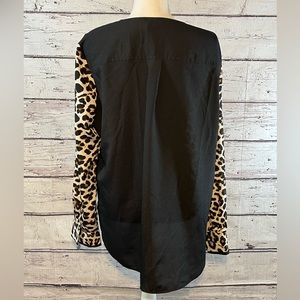 Gently used leopard print blouse in lightweight 100% polyester. Wrap front with hook/eye closure at the bust. Back is solid black & has longer hem. Looks like a large but no size tag so please refer to measurements. Measures 24" pit to pit and 23" shoulder to hem (front) and 29" shoulder to hem (back).