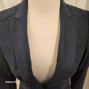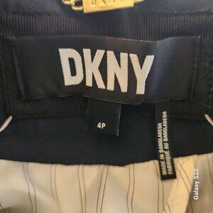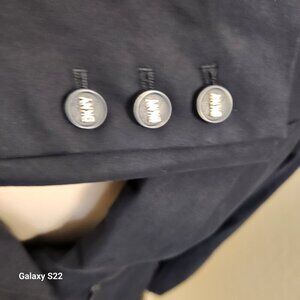 DKNY Blue Blazer. NWT. Size 4P. No rips/stains/scuffs/pulls. Perfect. Love all the DKNY logo details! Single button closure. Buttons up the wrist area. Fully lined. Two functional zipper pockets. Extra button on interior. Measurements: Pit to pit: 15.75 inches. Shoulder to bottom: 24 inches. Smoke free home. Material: Cotton/Poly mix has a small amount of stretch. No odors. All offers are welcome. Thank You!