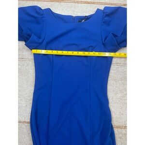 New with tags DKNY women's sheath dress in a bold cobalt blue, size 6. Features a scoop neckline, back zipper closure, and dramatic flutter sleeves with chiffon overlay detail. Tailored silhouette offers a polished and flattering fit. Made with stretch fabric for comfort and ease of movement. Perfect for cocktail parties, weddings, work events, or special occasions.