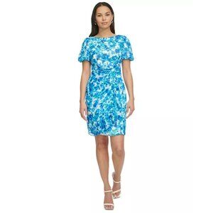 DKNY Blue Green Watercolor Print Chiffon Dress Size 12 Short Bubble Sleeves