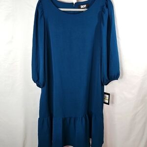 This DKNY dress in a rich blue hue features a flattering A-line silhouette with a crew neck and 3/4 puff sleeves, perfect for casual or work settings. The soft fabric drapes beautifully, offering both style and comfort. 39" Length 22" Pit to Pit