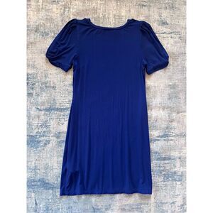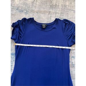Deep royal blue tee shirt dress from DKNY. Short cuffed sleeves with pleats. Soft stretchy jersey knit fabric. Round crew neckline.