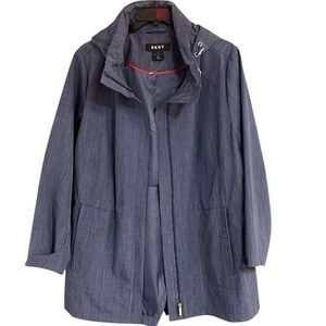 DKNY Blue Trench Rain Coat Tuck able Hood Zipper Front Pockets