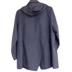 This coat as a denim look. It’s perfect for the spring. It’s light weight. Minimalist the hood can be worn out or tucked in.
