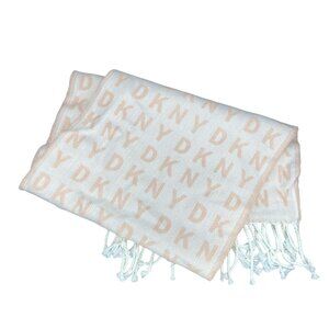 DKNY Blush Pink White Soft Cozy Monogram Logo Fringe Winter Scarf 68" X 11.5"
