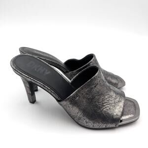 These DKNY women's Bronx sandals are metallic leather open toe heeled sandal mules.