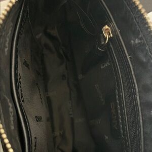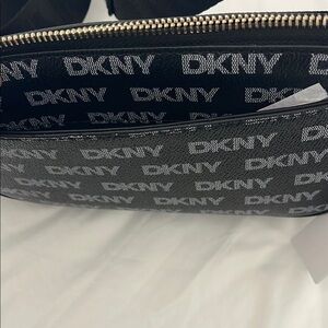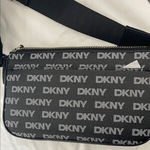Stylish DKNY crossbody bag. Features logo pattern. Adjustable strap for comfort. That measures 9 x 5 1/2 x 2. Has back pocket and two additional pockets inside.