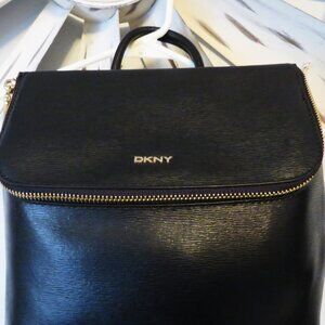 DKNY Bryant Top Zip Backpack Black & Gold Tone. Used one time for an outing. The bag has two very small flaws shown in picture. The mark on top in hardly noticeable, I only seen them in it in the photos.
