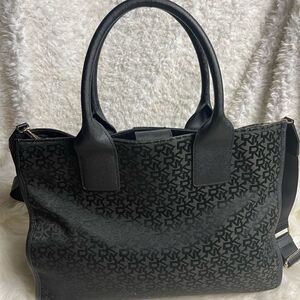 DKNY Carlita Large Black Fabric logo satchel with synthetic leather trim &straps top snap closure the inside lining has a side zipper and two side pockets. Pre owned in good used condition signs of wear on the handle straps. See all pictures any questions please message.Z1