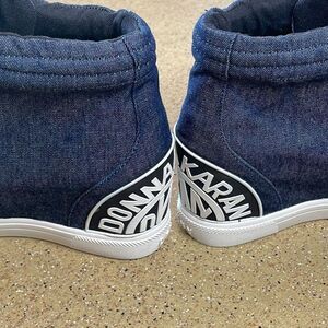 DKNY Chambray Denim Wedge Zip Front Sneakers 7 Dark Denim Blue