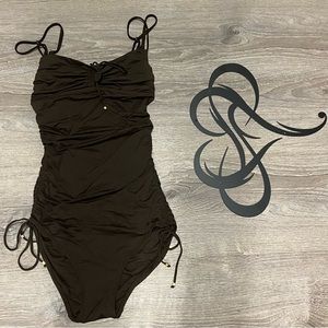 DKNY Chocolate Brown Ruched One Piece Swimsuit | Tie Detail | Size M (8)