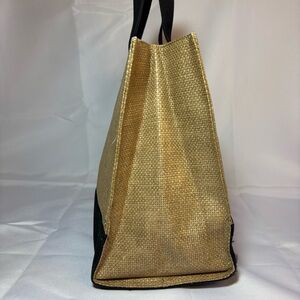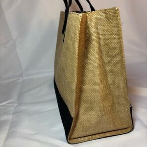 • Tan woven straw body, black accents, and black handles.