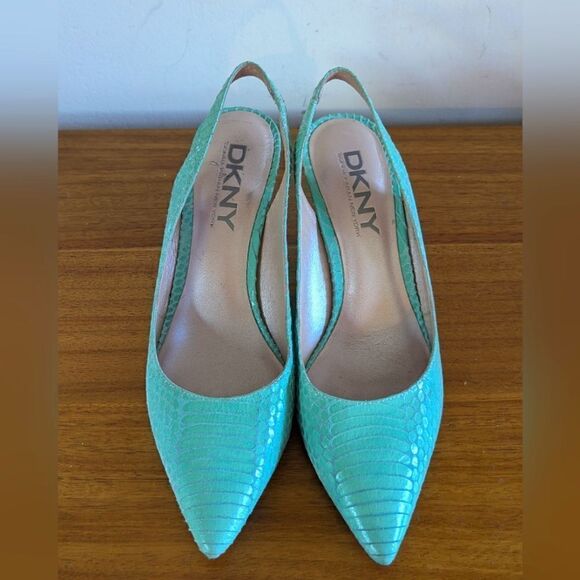 Description: DKNY Persey Seafoam Leather Snakeskin Textured Slingbacks Coastal Beach Mermaid Tropical Chic 6, beautiful textured leather with leather wrapped heel, some signs of wear on the insole and soles but she’s overall in great condition