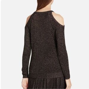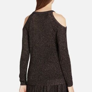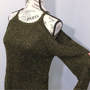 hip, modern, trend, chill, high end, Fall, Winter, Versatile, comfortable, comfy, basic, Chic, Classic, contemporary, lightweight, stretchy, Relaxed fit, loose fit, Women, Professional, unique, eclectic, Retro,, maximalism, Night out, Dinner, date night, evening, Holiday, Festive, Christmas party New Years Eve casual DKNY Cold Shoulder Knit Sweater Metallic Black Gold Shimmer Medium