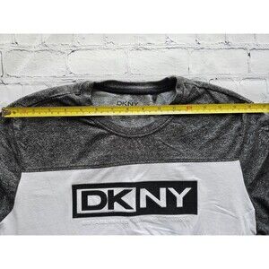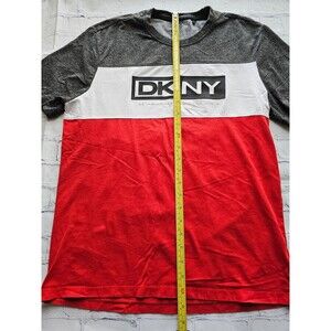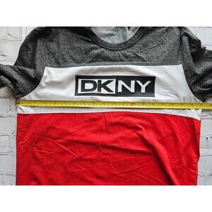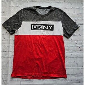 Pre-owned DKNY colorblock T-shirt in size Small. Features a bold DKNY logo across the front chest with raised textured lettering, in a stylish gray, white, and red colorblock design. Made from soft and comfortable fabric, this short sleeve crewneck tee is perfect for casual everyday wear. Shows minimal signs of previous use and is in good overall condition.