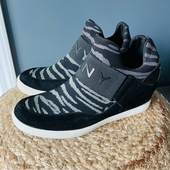 Cosmos Slip On Wedge Sneakers with a Zebra Print Upper and DKNY Logo on Stretch Strap at Vamp. 2.5” Hidden Wedge, 1/2” Platform. Great Condition 🚭